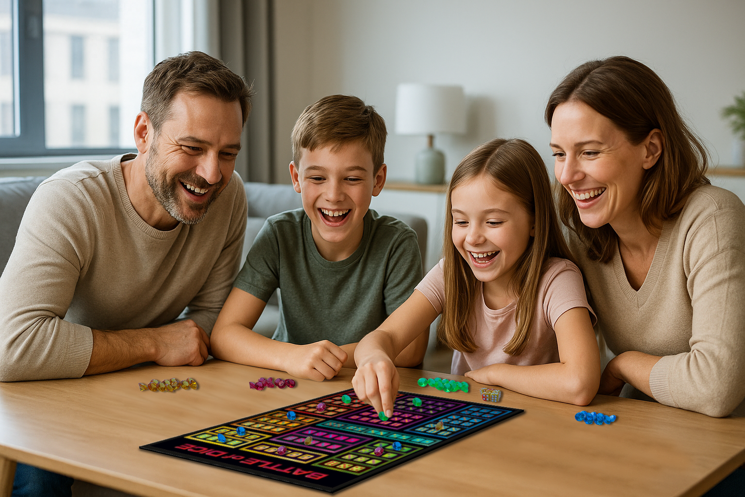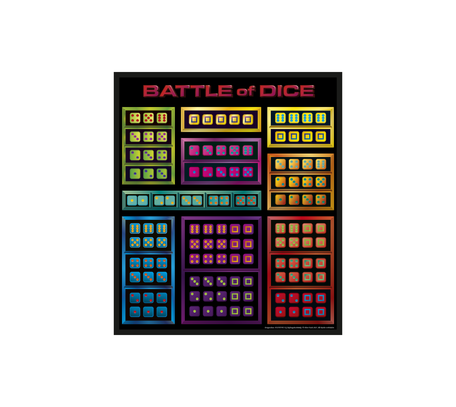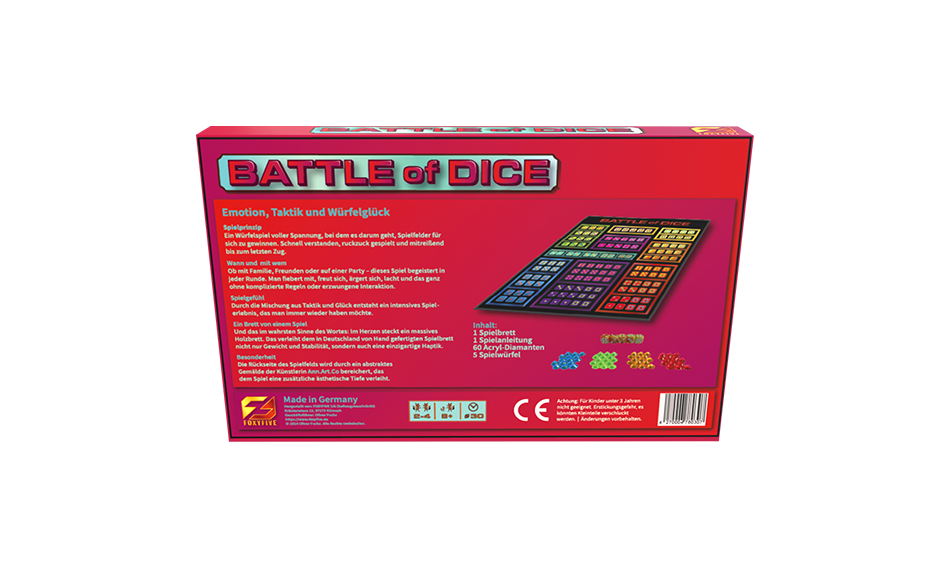Hergestellt von einem spezialisierten Verpackungsunternehmen in Deutschland, steht auch die Box für Qualität – durchdacht, kompakt und hochwertig verarbeitet. Sie ist platzsparend, stabil und genau auf das Spiel abgestimmt. Kein überdimensionierter Karton, der mehr verspricht als er hält – sondern genau das, was Battle of Dice verdient: Qualität ohne Übertreibung.